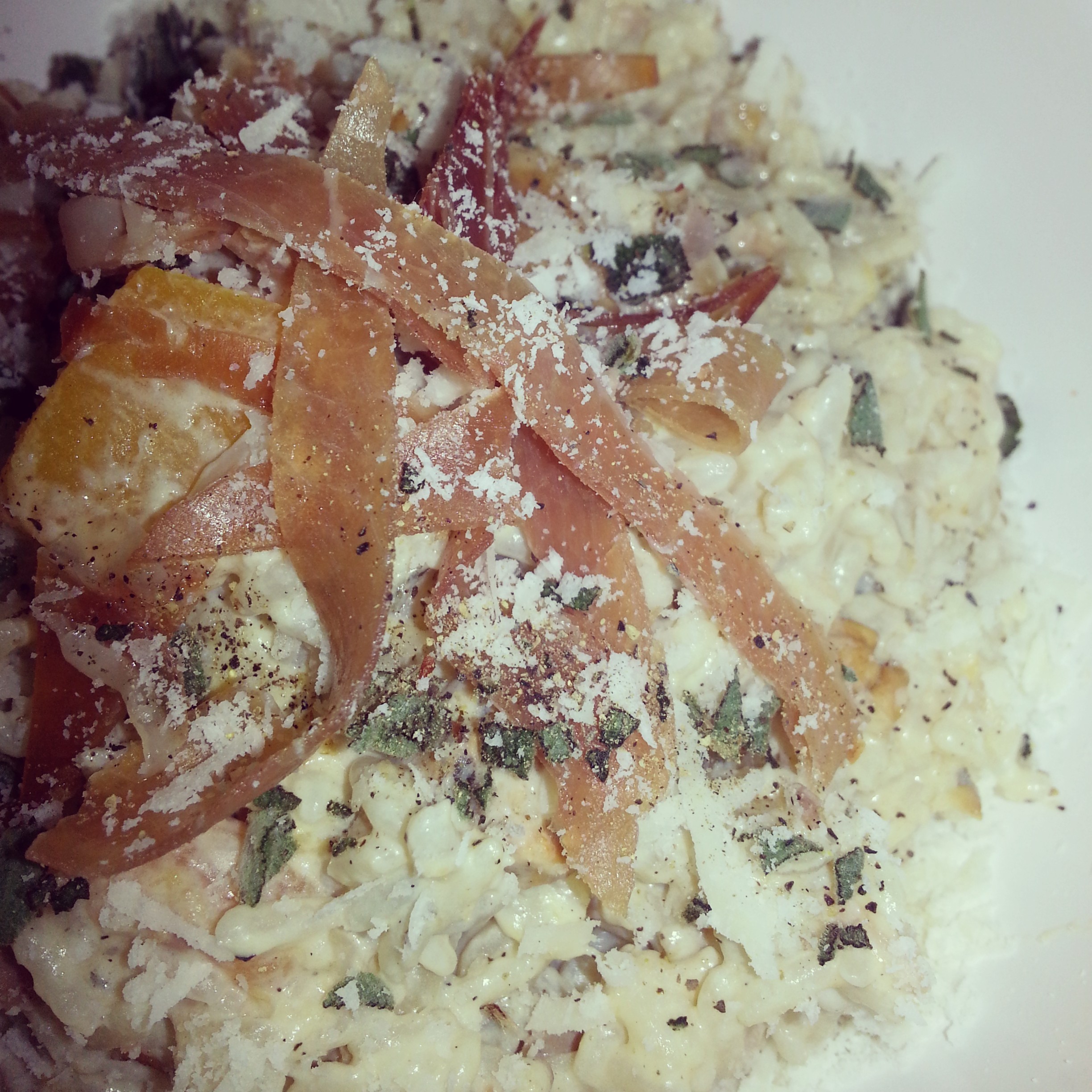 In the end I added the roasted squash & chestnuts, bits of proscuitto, lots of pecorino and chopped sage. I must say the flavors were great, but I knew it was not what it was supposed to be. I decided to re-purpose this crime into a pan fried cake delight. I even went on to make a butternut squash puree to serve under the cakes and I crisped sage to top it all off.
