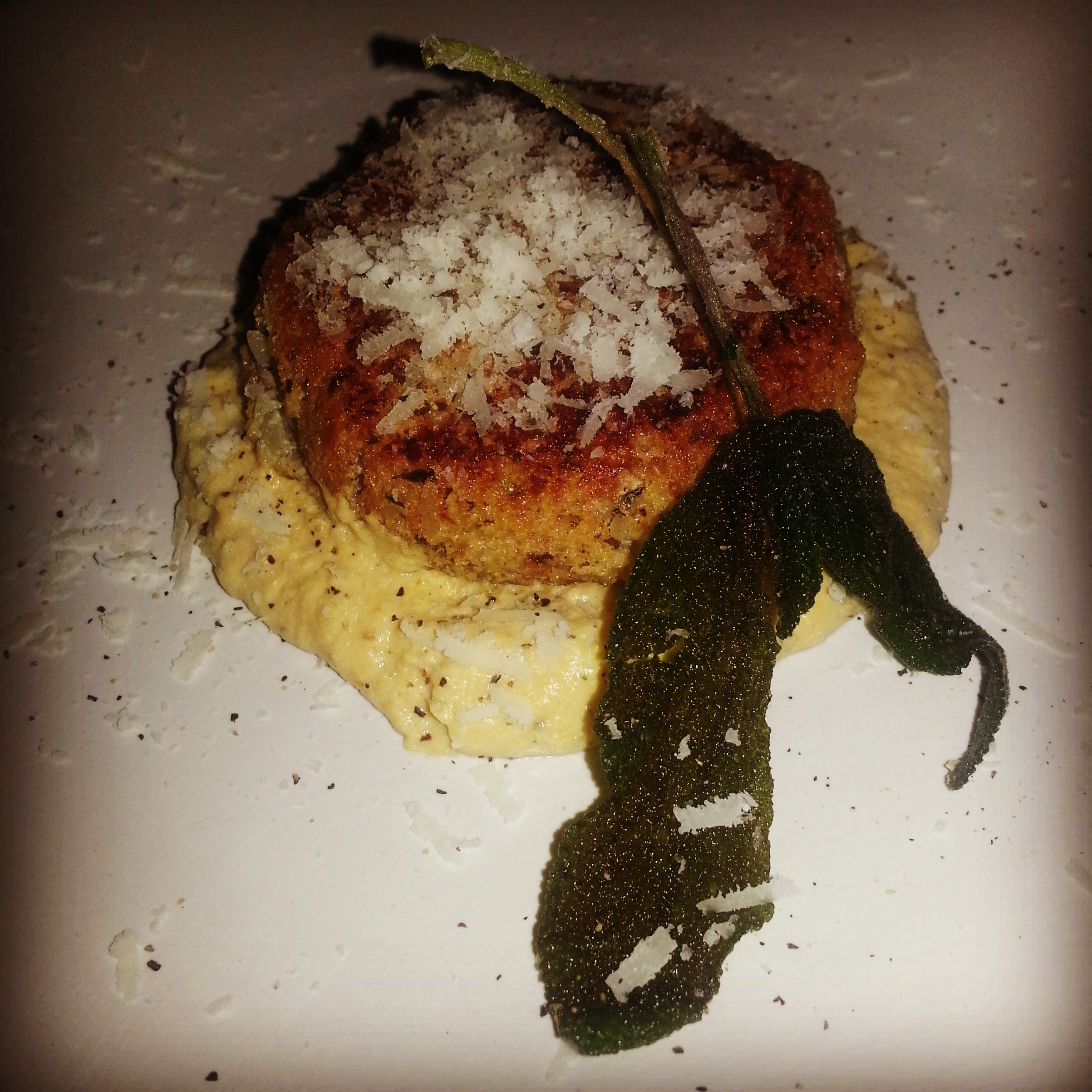 Before frying the cakes, you should make the puree. Start with a little olive oil in a sauce pan. Add garlic, onion, sage, salt, pepper and dry mustard. Once the onions are clear, chop the other half of the butternut squash and toss it in. Pour in the chicken stock and cook on medium heat for at least ten minutes. Once the stock has reduced and everything is soft, grab an immersion blender and puree until smooth. Add cream to your liking. Place a bit of this sauce on the plate and top it with a cake. Grate fresh pecorino and splash black pepper for garnish.