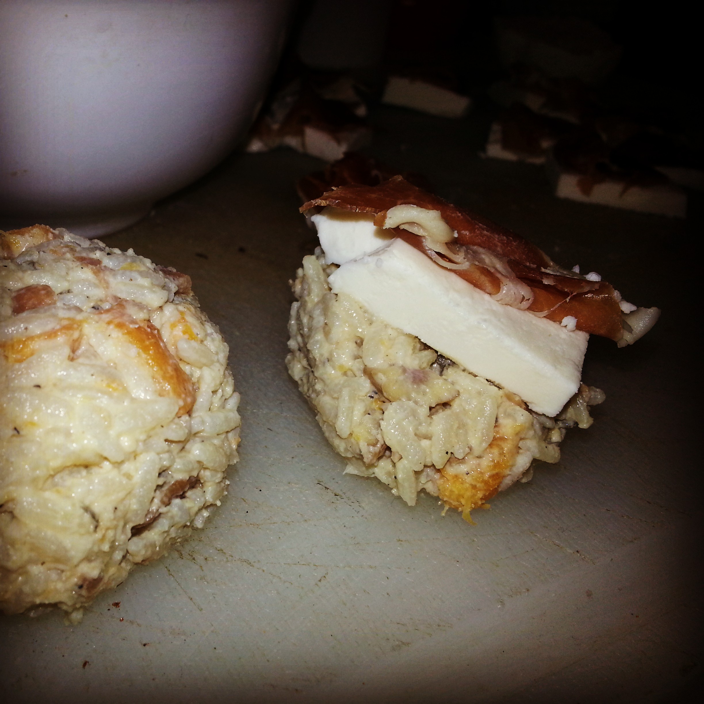 At this point you should start slicing the fresh mozzarella into small squares. Slice the leftover proscuitto into pieces around the same size as the mozzarella. Start taking heaping tablespoons of the rice mixture and forming them into balls. Take pieces of mozzarella and proscuitto and place them on top of a ball. Now, take more of the rice mixture and build it around the meat and cheese. Once everything is enclosed, flatten the ball slightly so it is a cake around 3″ in diameter. Repeat this process until all the rice has been utilized.